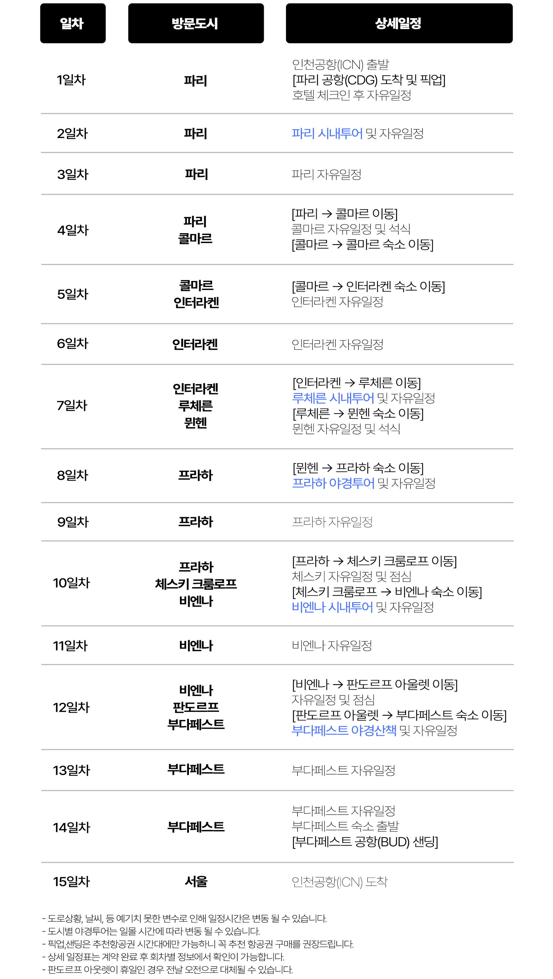 ※ 파리~프라하는 서유럽+프라하 팀과 일정을 같이 합니다.